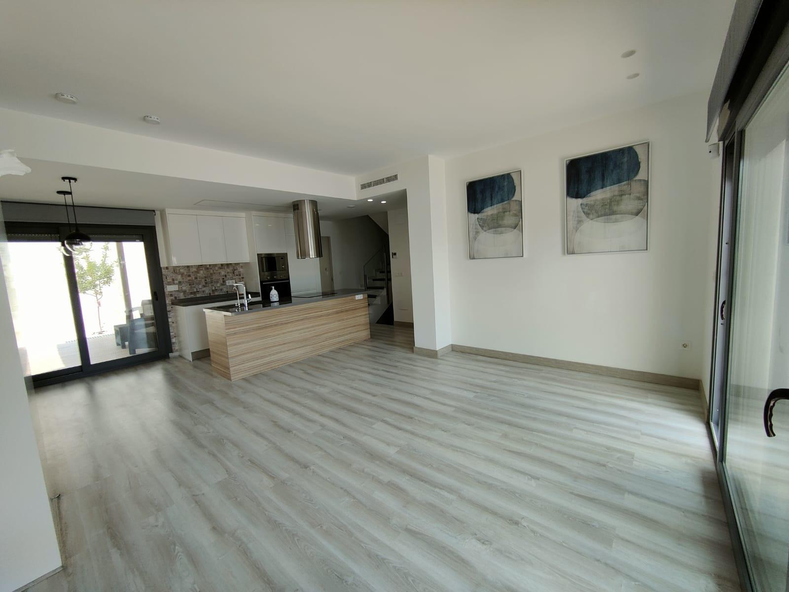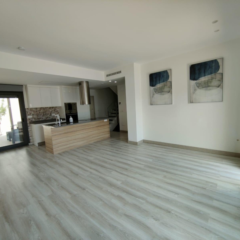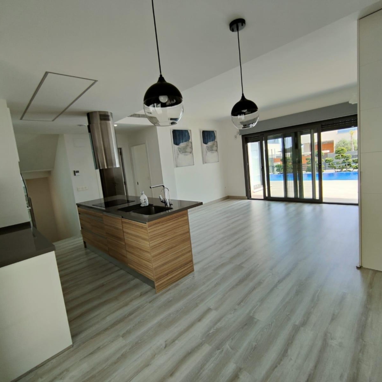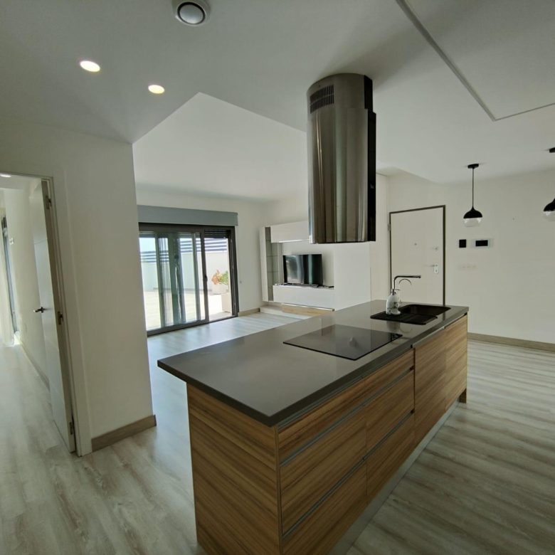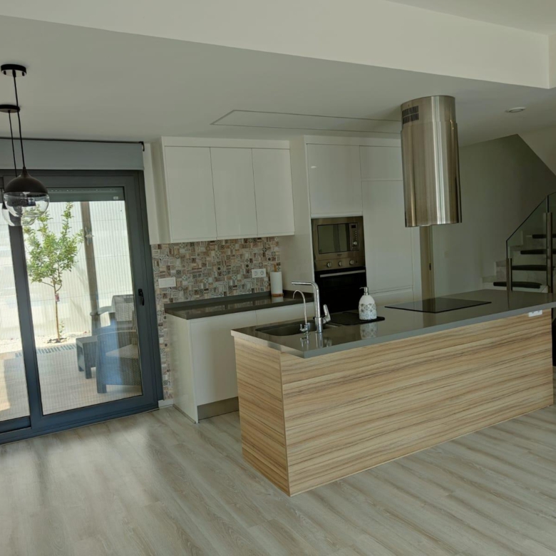 La planta principal alberga una cocina abierta totalmente equipada, un elegante salón comedor con acceso directo a la terraza, y un espacio ideal para despacho u oficina.