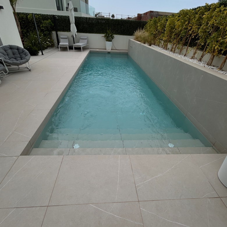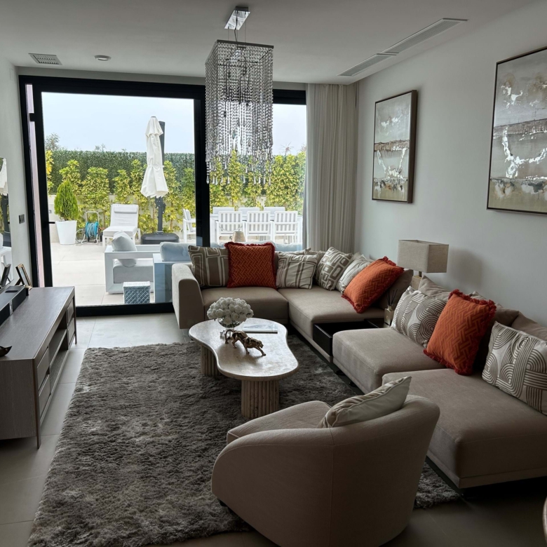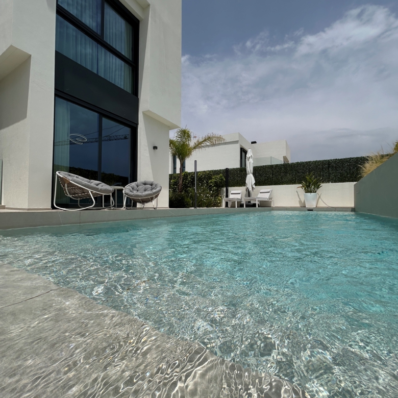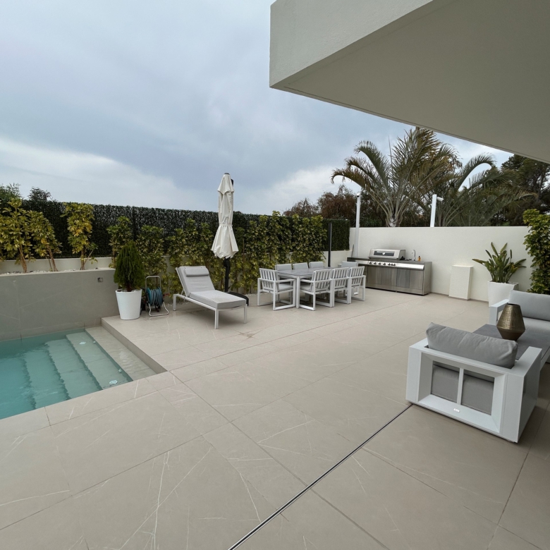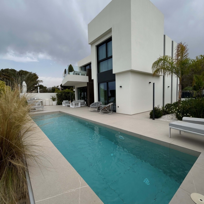En el exterior, la villa cuenta con una piscina privada rodeada de una cuidada zona ajardinada, perfecta para disfrutar del clima mediterráneo durante todo el año.
