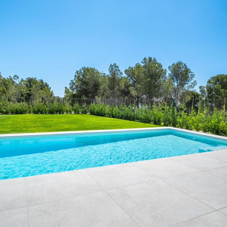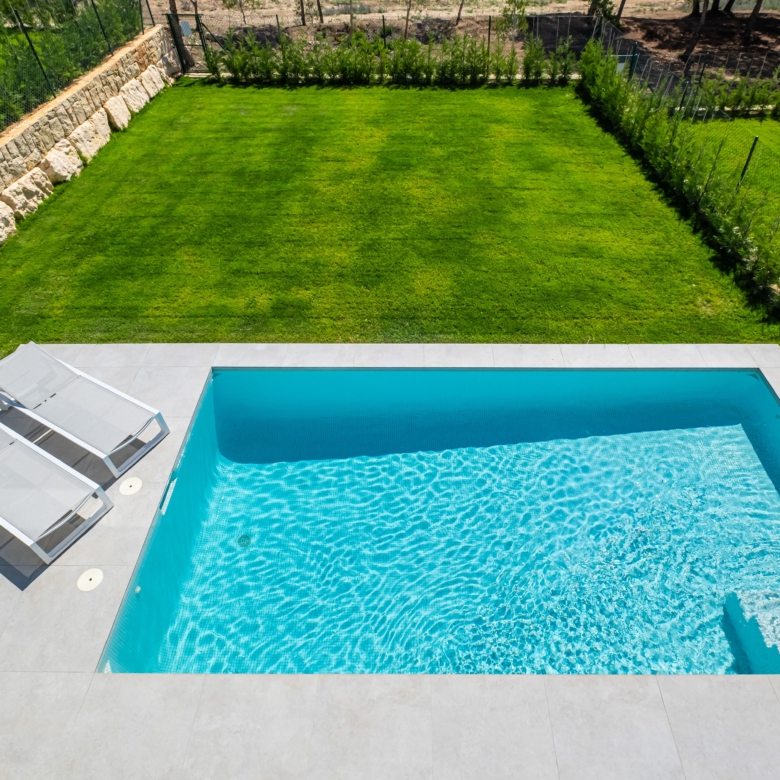 La parcela de 401 m² incluye una piscina privada y jardines cuidadosamente diseñados, ideales para relajarse, disfrutar del sol y organizar reuniones al aire libre.